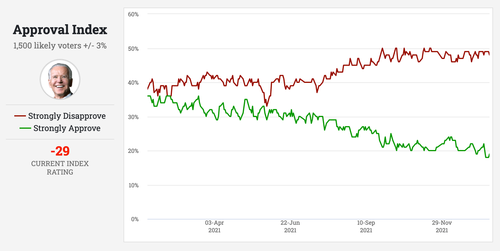 Joe Biden is close to one year in office, and his current poll numbers continue to drop. According to the daily Rasmussen Report, his numbers are at an all-time low, even surpassing Donald Trump’s worst.