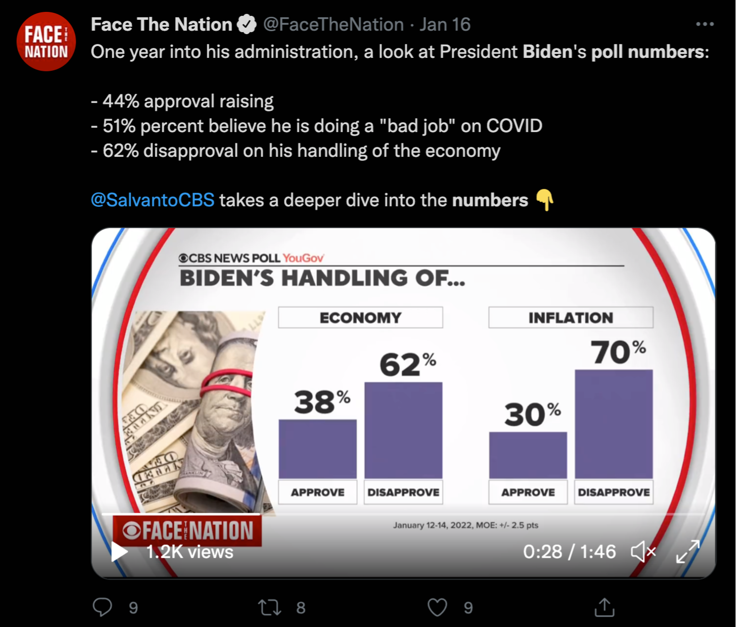 According to CBS analyst Anthony Salvanto who appeared Sunday on Face The Nation, what factors into these numbers are several things, including Biden’s policies, supply chain issues, and more.