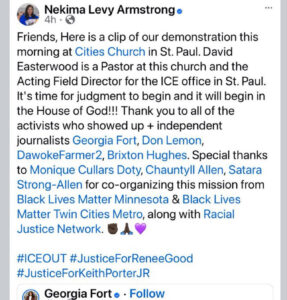 - Nekima Levy Armstrong, 49: A civil rights attorney and former Minneapolis NAACP president with a long history of confrontational protests. She participated in the 2014 Ferguson unrest, faced (later dismissed) charges from a Mall of America BLM demonstration, and was arrested during a 2015 Interstate 94 blockade after the Jamar Clark shooting. Armstrong currently runs cannabis company Dope Roots, and allegedly played a key role in organizing the church invasion. She also filmed herself as she disrupted the worship service at The Cities Church and is included in other clips filmed by former CNN journalist Don Lemon, both before and after the disruption, which continued outside the building. Later, posting on her social media, she declared, “It’s time for judgment to begin and it will begin in the House of God!!!”