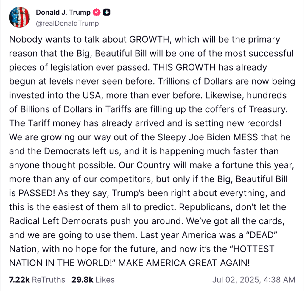 “Nobody wants to talk about GROWTH, which will be the primary reason that the Big, Beautiful Bill will be one of the most successful pieces of legislation ever passed. THIS GROWTH has already begun at levels never seen before. Trillions of Dollars are now being invested into the USA, more than ever before. Likewise, hundreds of Billions of Dollars in Tariffs are filling up the coffers of Treasury. The Tariff money has already arrived and is setting new records!”