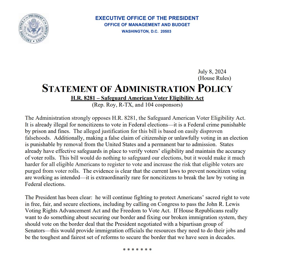 The Biden Administration released a statement on Monday, voicing the President’s opposition to the SAVE Act while also saying “he will continue fighting to protect Americans’ sacred right to vote in free, fair, and secure elections…”