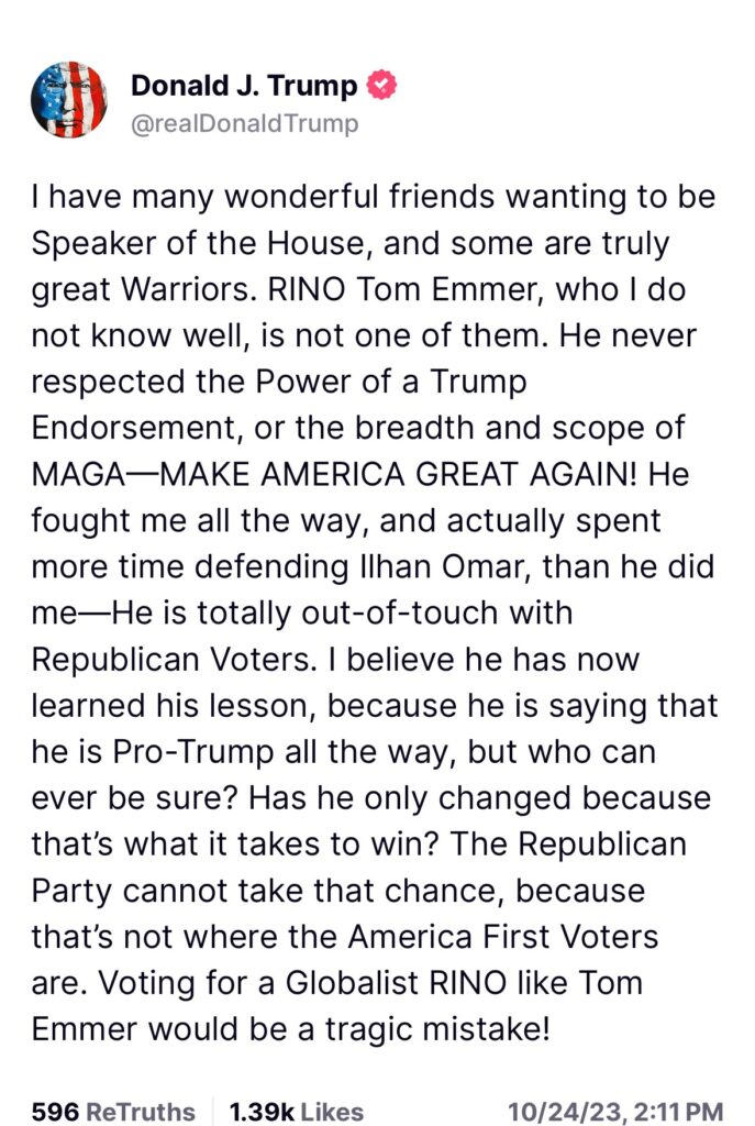 Trump also stated he has “…Wonderful friends wanting to be Speaker of the House, and some are truly great Warriors. RINO Tom Emmer, who I do not know well, is not one of them. He never respected the Power of a Trump Endorsement, or the breadth and scope of MAGA—MAKE AMERICA GREAT AGAIN!”