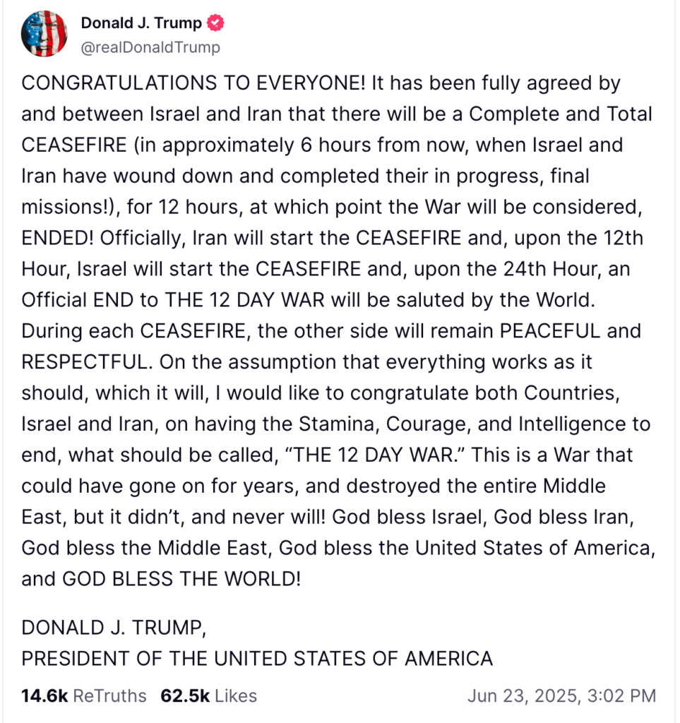 President Trump’s statement today struck a hopeful tone, commending both Israel and Iran for their “stamina, courage, and intelligence” in reaching a peaceful resolution. He noted that the war could have easily spiraled into a prolonged and devastating conflict but didn’t—and he expressed hope that it never will.