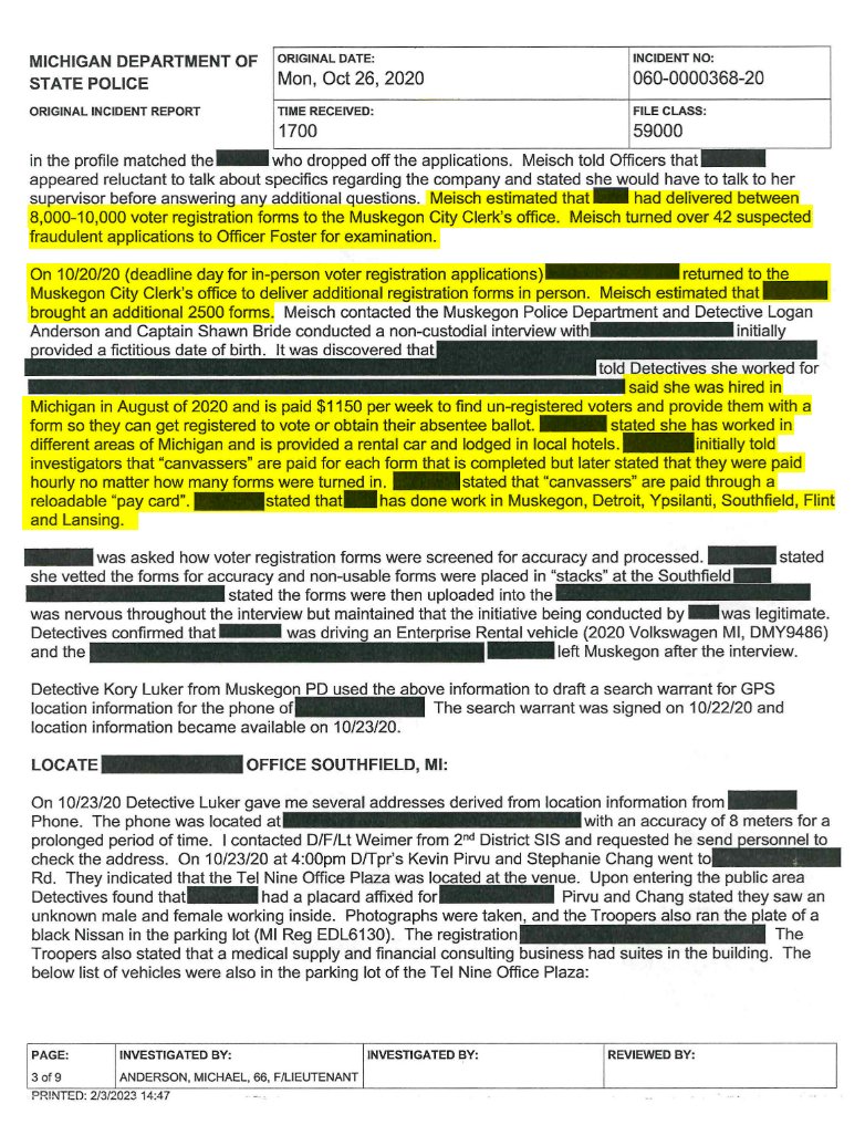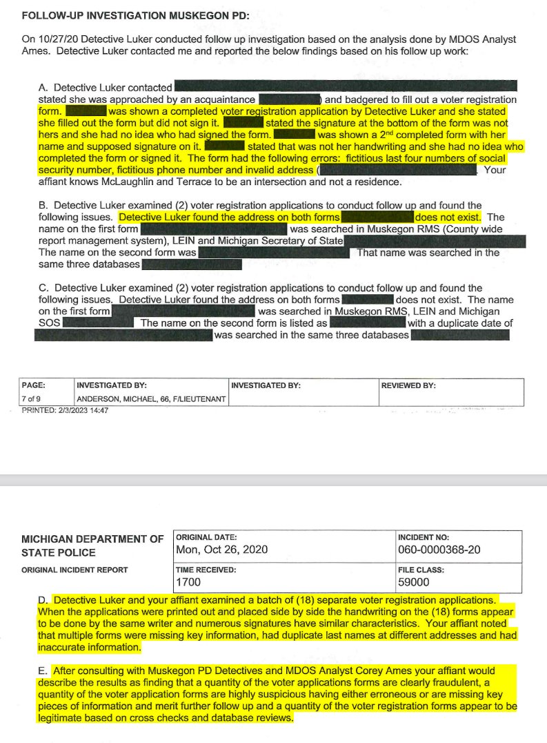 The investigation was initiated following the observation of a Muskegon, Michigan, clerk who noticed an individual depositing 8,000 to 10,000 completed voter registration applications at the city office on October 8, 2020. This same individual returned multiple times, registering an additional 2,500 voters. Alarmingly, many of these registrations displayed identical handwriting with fraudulent addresses and phone numbers. Additionally, signatures did not match those on file with Michigan’s Secretary of State.