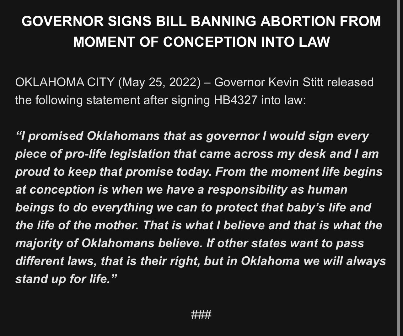 Governor Stitt released a statement after signing the bill: “I promised Oklahomans that as governor, I would sign every piece of pro-life legislation that came across my desk and I am proud to keep that promise today.”