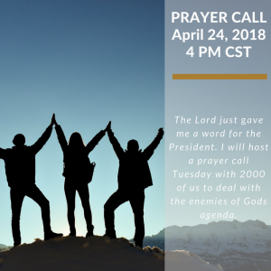 The Lord just gave me a word for the President. I will host a prayer call Tuesday, April 24, 2018 with 2000 of us to deal with the enemies of Gods agenda.