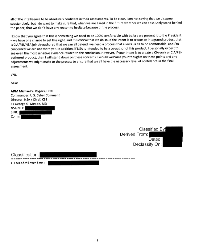 That same day, NSA Director Admiral Mike Rogers had sent a very different kind of message. Concerned about the rush to finalize the Intelligence Community Assessment (ICA) — the report that would formally declare Russian interference — Rogers warned that the NSA had not thoroughly reviewed the underlying evidence: