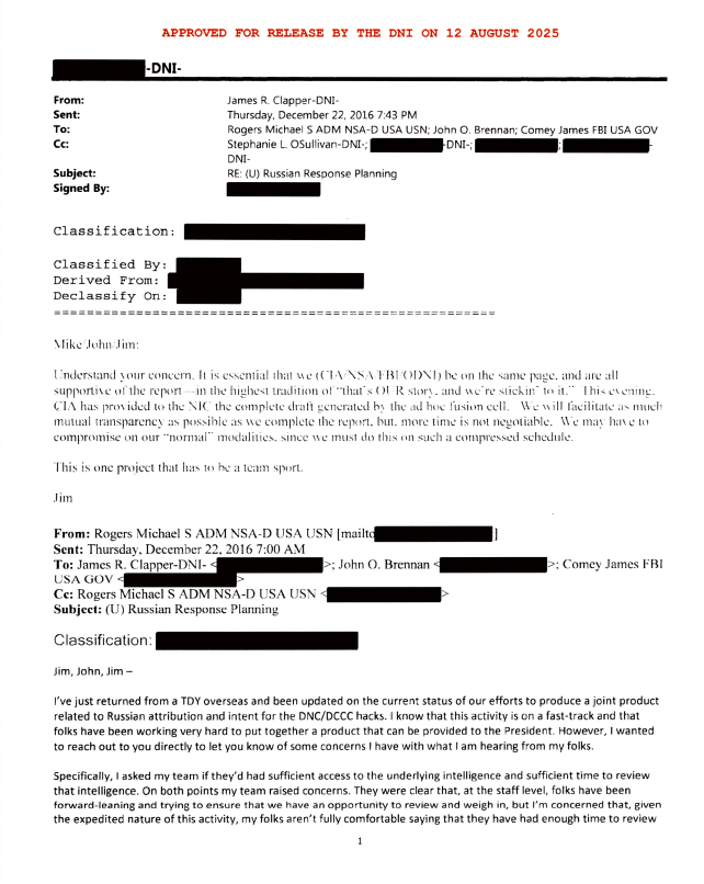 Among the releases are December 22, 2016, messages between then–DNI James Clapper and top intelligence officials that reveal more than just bureaucratic coordination. In one, Clapper presses agency heads to present a united front on the conclusion that Russia interfered in the 2016 election — despite internal doubts — declaring: